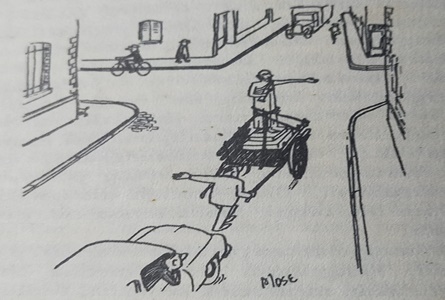 Patung orator itu menunjuk ke kanan tanda menegaskan isi pidatonya, sementara pendorong gerobak menunjuk ke arah kiri tanda ambil jalan yang mau dilalui. Mobil di belakang gerobak bingung.