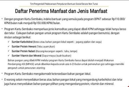 Dia memaparkan, program kartu sembako tersebut memperluas komoditas yang dapat dibeli KPM, tidak hanya beras dan telur. Cakupan bahan pangan untuk program kartu sembako adalah pangan bernutrisi.