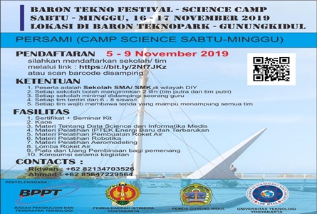 Tanggal 16-17 November 2019, Sabtu dan Minggu camping Ilmu pengetahuan diselenggarakan di kompleks Baron Techno Park (BTP), sebelah barat Parang Racuk Pantai Baron.