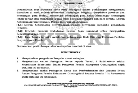 Sementara pihak yang diadukan ke DKPP adalah Sudihartono, Koordinator Sekretariat Bawaslu Gunungkidul dan Is Sumarsono, SH Ketua Bawaslu Gunungkidul.