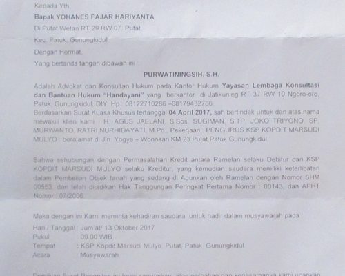 PATUK, Jumat Legi – Yohanes Fajar Hariyanto warga RT 29/07, Padukuhan Putat Wetan, Desa Putat, Kecamatan Patuk, Gunungkidul, kaget menerima surat pemberitahuan dari Pengacara. Jumat (13/10) Fajar diminta datang ke Kantor KSP Kopdit Marsudi Mulyo, sementara dia merasa tidak ada urusan utang piutang dengan lembaga itu.