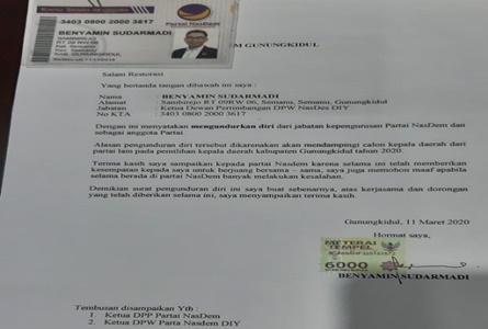 GUNUNGKIDUL – SENIN PON | Politisi NasDem, Benyamin Sudarmadi, secara mengejutkan menulis surat pengunduran diri. Supardjo, Ketua DPD NasDem Gunungkidul mengirim duplikat surat tersebut ke infogunungkidul.com Senin 23/3/20 pukul 16.16 Wib.