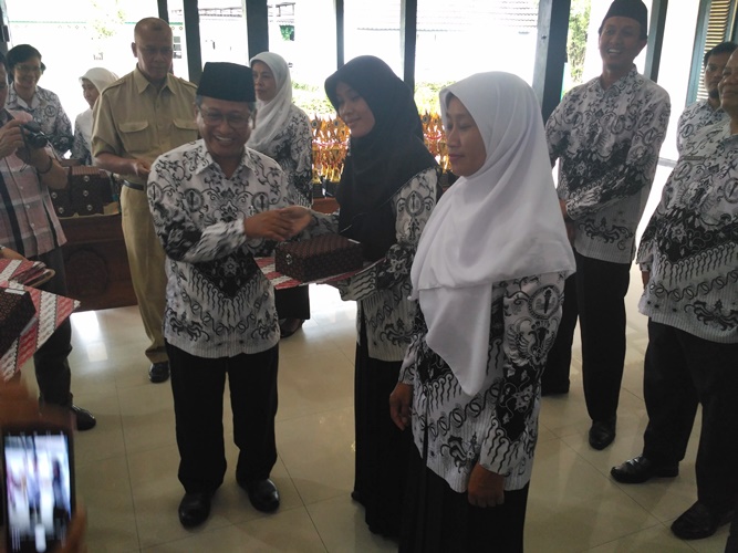 WONOSARI, Rabu Legi-Penghargaan kepada 36 guru, kepala sekolah dan pengawas yang berprestasi diberikan di Bangsal Sewoko Projo, Selasa, (21/11) bersamaan dengan memperingati Hari Guru Nasional dan HUT ke 72 Persatuan Guru Republik Indonesia (PGRI).