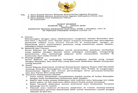 JAKARTA, -Kementerian Agama Republik Indonesia mengeluarkan Surat Edaran Nomor 6 tahun 2020. SK tersebut berisi tentang panduan ibadah Ramadhan dan Idul Fitri 1 syawal 1441 Hijriyah di tengah pandemi Covit-19.