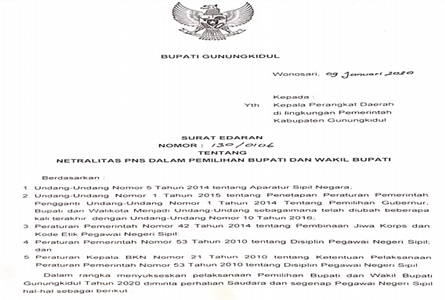 WONOSARI – Kamis Kliwon | Bupati Gunungkidul, Hj. Badingah, S. Sos mengeluarkan Surat Edaran nomor 130 / 0106, tertanggal 9 Januari 2020. Surat Edaran BupatiĀ  berisi tentang netralitas pegawai negeri sipil (PNS) terkait dengan pemilihan bupati dan wakil bupati Gunungkidul tahun 2020.