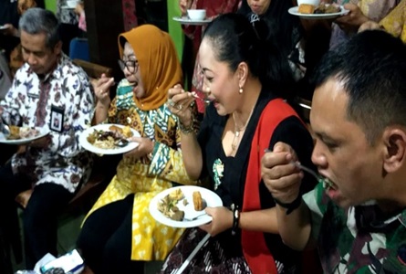 Secara bareng-bareng Badingah menikmati olahan daging RM Sakinah Bedoyo, sembari menyerukan, warga tidak perlu takut mengkonsumsi daging, baik sapi maupun kambing.