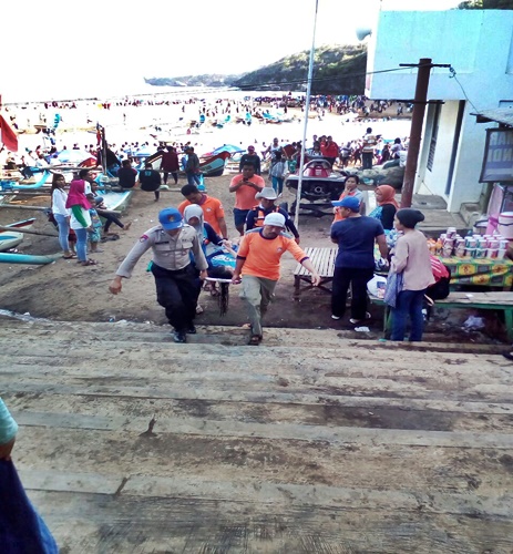 GUNUNGKIDUL, (Sabtu Wage)-Asik bermain air di Pantai Siung, Purwodadi, kecamatan Tepus, Aldin Satria Raditya (15), wisatawan asal Jati Baru, Solo, Jawa Tengah, terseret ombak dan tenggelam. Di hari yang sama kejadian serupa juga dialami Nova Alinda Putri (15) wisatawan asal Magelang, Jawa Tengah. Ia terseret ombak dan tenggelam saat bermain air di Pantai Baron, Kemadang, Tanjungsari, Sabtu, (23/06).
