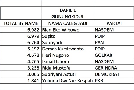 Drs. Supriyadi 6.264, Demas Kursiswanto (Ketua DPRD Gunungkidul 5.197, Heri Nugroho 4.678 by name, sebagai incumbent menurut Jepe dianggap biasa.