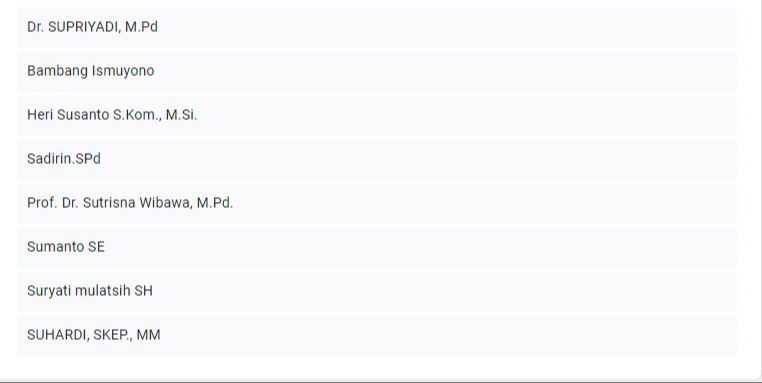 “Hingga 10:21 WIB, 8 nama tercatat ikut mendaftar antara lain Dr. Supriyadi, M.Pd, Bambang Ismuyono, Heri Susanto S.Kom., M.si, Sadirin. SP.d, Prof. Dr. Sutrisna Wibawa, M. Pd, Sumanto SE, Suryati Mulatsih SH, Suhardi, SKEP., MM,” terang Purwanto.