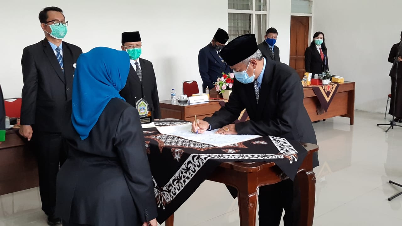 WONOSARI-KAMIS WAGE | Bupati Gunungkidul Badingah melantik Toto Sugiharta sebagai Direktur Utama Perusahaan Daerah Air Minum (PDAM) Tirta Handayani pada Kamis (19/11/2020). Pelantikan berlangsung di Rumah Dinas Bupati Gunungkidul, Wonosari.