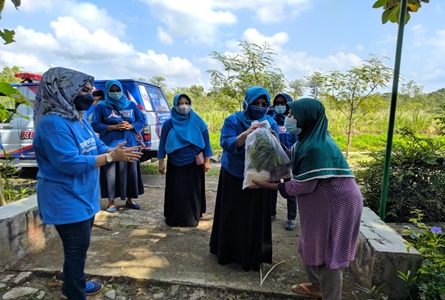 PLAYEN-KAMIS WAGE | Ketua DPC Partai Demokrat Gunungkidul Supriyani Astuti, S.Sos. bersama Wakil Sekretaris Agus Wigi, SE menyongsong HUT Partai Demokrat ke-20, bergerak dari pintu ke pintu mengantar sembako ke warga kurang mampu yang melakukan isolasi mandiri.