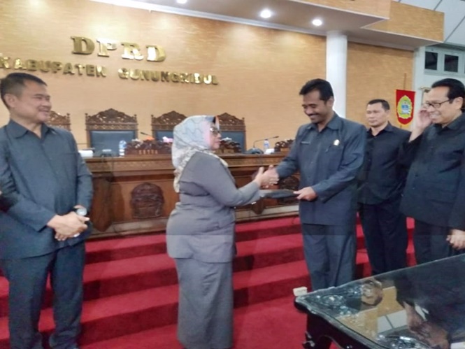 Usai pembacaan pemandangan umum frakasi dilanjutkan Penandatangan kesepakatan bersama Bupati, Ketua DPRD dan Wakil Ketua DPRD disaksikan Ketua Ketua Fraksi. (Joko)