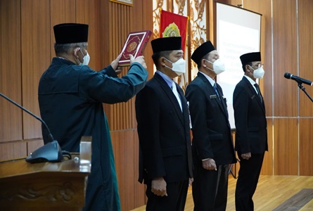 Pelantikan dan pengambilam sumpah jabatan pimpinan tinggi pratama di lingkungan pemerintah Kabupaten Gunungkidul oleh Bupati Sunaryanta dilaksanakan di Ruang Rapat Handayani, Jumat (17/12/2021)