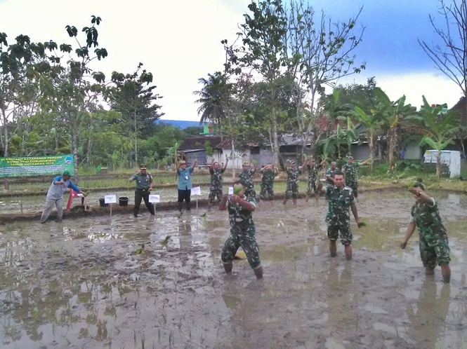 WONOSARI, JUMAT KLIWON-Jajaran TNI dipimpin langsung Letkol Inf M. Taufik Hanif Komandan Kodim 0730/Gunungkidul tidak segan-segan terjun langsung dan ikut menanam padi guna mendukung pemerintah dalam meningkatkan ketahanan pangan nasional. Salah satunya dengan memanfaatkan lahan kering di Dusun Purbosari, Desa Wonosari, Kecamatan Wonosari, untuk menanam padi jenis Mikongga, Jumat (20/4).