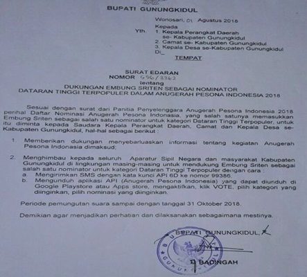SE yang ditandatantani Badingah berisi dua item: pertama, melakukan vote API sekaligus menyebarkan program API via SMS; kedua menghimbau ASN dan masyarakat mundukung API nminator DTT Embung Sriten.