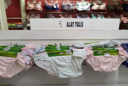 Harap maklum di atas etalase terpampang ‘alat tulis’ tetapi isinya pakaian dalam wanita.