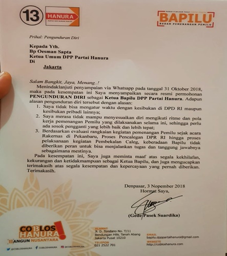 JAKARTA, SENIN LEGI-Ketua Badan Pemenangan Pemilu (Bapilu) Partai Hanura Gede Pasek Suardika resmi mengundurkan diri.