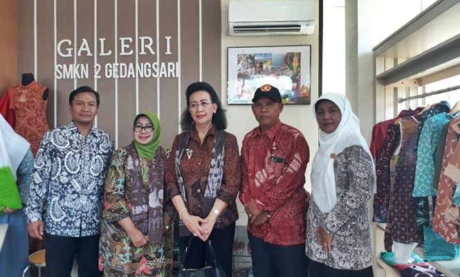 GEDANGSARI, JUMAT PON – Gusti Kanjeng Ratu (GKR) Hemas didampingi Dr. Grada Hijjawi Qaddumi (President of WCC Asia Pasific Region) berkunjung ke SMK 2 Gedangsari, di Desa Tegalrejo, Kecamatan Gedangsari, Kamis (04/10). Sebelumnya, GKR Hemas menyapa kelompok pembatik setempat.