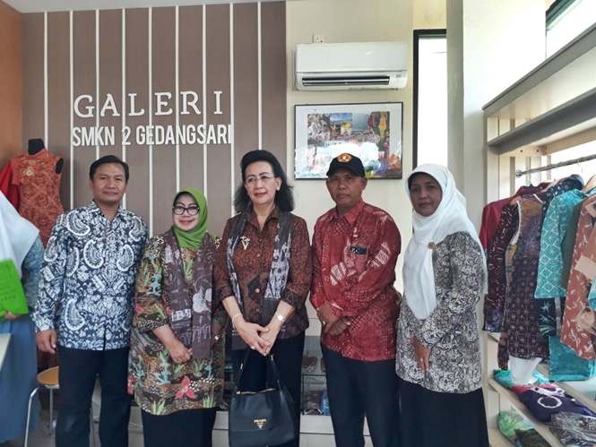 GEDANGSARI, JUMAT PON – Gusti Kanjeng Ratu (GKR) Hemas didampingi Dr. Grada Hijjawi Qaddumi (President of WCC Asia Pasific Region) berkunjung ke SMK 2 Gedangsari, di Desa Tegalrejo, Kecamatan Gedangsari, Kamis (04/10). Sebelumnya, GKR Hemas menyapa kelompok pembatik setempat.