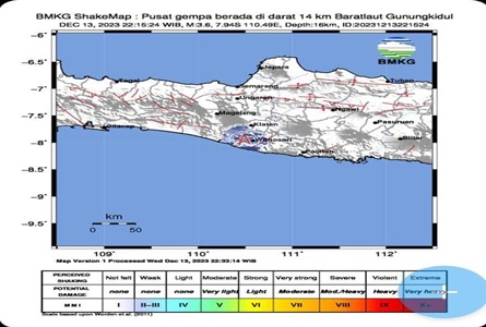 Gempa Magnitudo (M): 3,6 mengguncang Barat Laut Gunungkidul. Selain warga Gunungkidul, getaran gempa juga dirasakan sejumlah warga di Kabupaten Bantul hingga Kulonprogo, Rabu (13/12/2023) pukul 22.15 WIB.