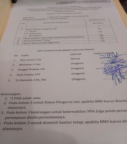 Dikatakannya, secara kelengkapan administrasi DPD Hanura provinsi Yogyakarta yang mempunyai Dewan Pimpinan Cabang (DPC) di Kabupaten Sleman, Bantul, Kulon Progo, Wonosari dan 1 Kota Yogyakarta dinyatakan memenuhi syarat.
