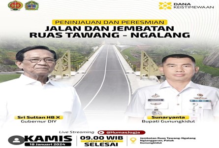 PATUK-KAMIS WAGE | Gubernur Daerah Istimewa Yogyakarta (DIY) Sri Sultan Hamengku Buwono X bersama Bupati Gunungkidul H. Sunaryanta rencananya akan melakukan peninjauan sekaligus peresmian jalan dan jembatan ruas Tawang-Ngalang, yang mencakup dua wilayah Kapanewon yakni Patuk, dan Gedangsari, Kabupaten Gunungkidul, Kamis (18/01/2024) pukul 09.00 WIB.