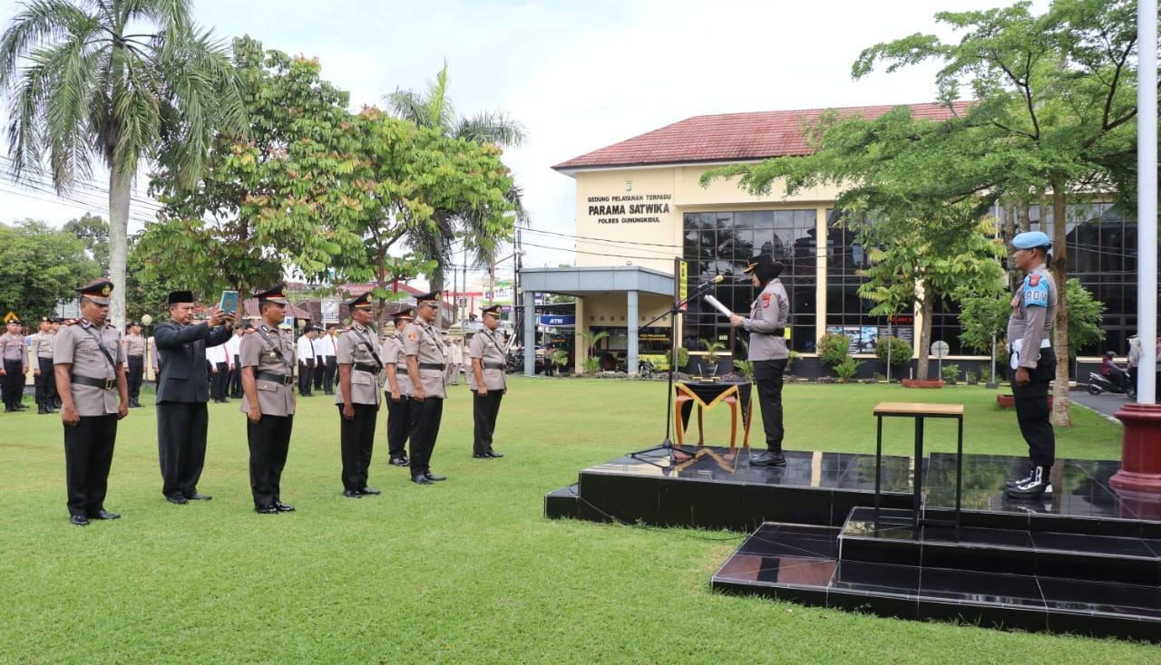 ”Kepada para pejabat yang lama, saya mengucapkan terima kasih dan penghargaan setinggi-tingginya atas dedikasi, loyalitas, dan sumbangsih yang telah diberikan selama bertugas di Polres Gunungkidul. Semoga sukses di tempat tugas yang baru,” ujar Kapolres.