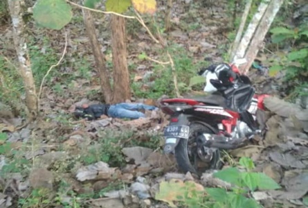 Saat ditemukan warga, sepeda motor dalam posisi tersangkut di pohon, sementara korban tergeletak di bawah pohon jati.