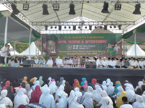 Hal di atas disampaikan di depan ribuan santri NU se Gunungkidul pada apel akbar dan Istighosah di alun-alun Pemda, Minggu (22/10).