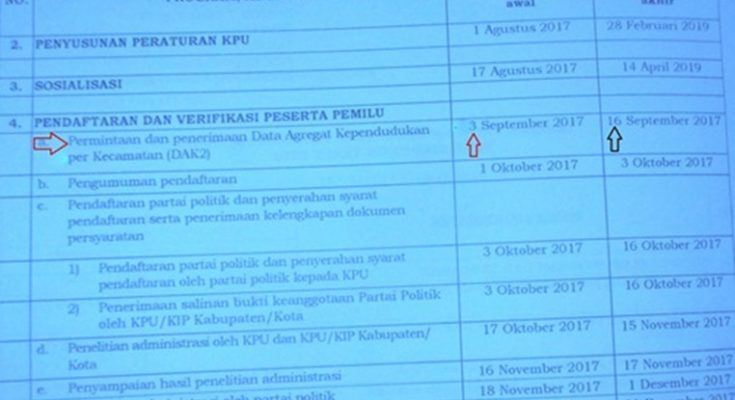 WONOSARI, Selasa Pahing – Merujuk tahapan, program dan jadwal penyelenggaraan pemilu 2019, September 2017, masing-masing KPUD Kabupaten melakukan pendaftaran dan verifikasi peserta pemilu. KPUD Gunungkidul, mulai 3/11/17 hingga 16/11/17, dijadwalkan meminta dan menerima Data Agregat Kependudukan per Kecamatan (DAK2).