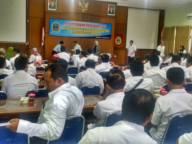 WONOSARI, RABU LEGI-Pemerintah Kabupaten Gunungkidul memberikan penghargaan kepada 50 desa yang telah melunasi PBB sebelum jatuh tempo. Penghargaan diberikan di Ruang Rapat Setda Gunungkidul, Rabu (07/11).