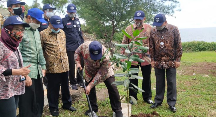 GUNUNGKIDUL-SABTU WAGE | Menristek Prof. Bambang Brodjonegoro melakukan kunjungan kerja ke Gunungkidul di dua lokasi sekaligus. Sebelum ke LIPI Gadung Menristen mengunjungi Baron Technopark (BTP). Di Parangracuk, usai menyimak paparan BTP, Menristek menandai pesatnya kemajuan teknologi energi baru terbarukan dengan menanam pohon nyamplung.