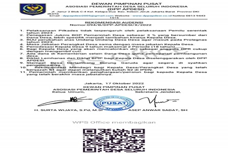 GUNUNGKIDUL -SENIN PON | Ketua Dewan Pimpinan Pusat (DPP) Asosiasi Pemerintah Desa Seluruh Indonesia (APDESI) menyusun draf rekomendasi. Draf itu bakal dijadikan bahan audiensi dengan Kementerian Dalam Negeri. Melalui Surat Nomor 094/B/DPP/APDESI/X/2022, dikeluarkan 11 Rekomendasi, kemudian diedarkan lewat group WhatsApp agar diketahui Perangkat Desa seluruh Indonesia. Sialnya 11 rekomendasi tersebut, utamanya poin 4 ditolak mentah-mentah oleh sebagian besar anggota.
