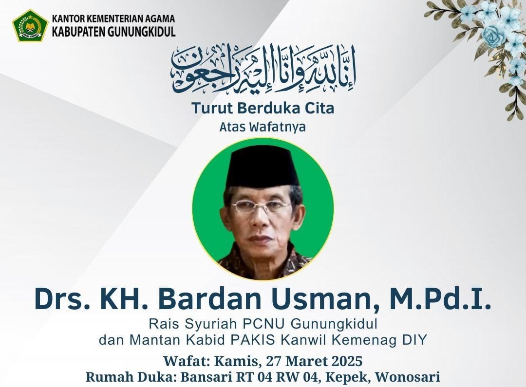 Terpisah, H. Mukotip, S.AG., M.Pd.I. atas nama Kepala Kantor Kementerian Agama Kabupaten Gunungkidul mengirimkan ucapan “Turut Berduka Cita” atas wafatnya Drs. KH. Bardan Usman, M.Pd.I.