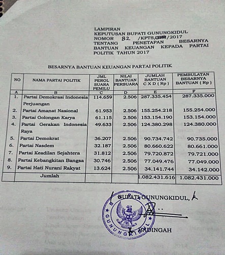 “Total bantuan keuangan untuk 9 Parpol di Gunungkidul sebesar Rp.1.082.431.000,-,” ujarnya.