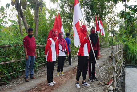 PALIYAN-MINGGU WAGE | Guna memperingati Hari Ulang Tahun (HUT) RI ke-75 yang jatuh pada hari Senin Kliwon (17/08/20) Karangtaruna Padukuhan Pampang, Kapanewon Paliyan, Kabupaten Gunungkidul dan Bhayangkari Polres Gunungkidul mengadakan kegiatan pengibaran bendera Merah Putih Minggu, (16/08/2020) pagi. Kegiatan tersebut dilakukan dengan cara mendatangi rumah warga di wilayah setempat.