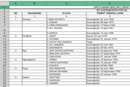 “Bacalon Lurah Semoyo yang terdaftar atas nama: 1. Mugi Riyanto, 2. Sudari, 3. Heru Purwanto, 4. Drs. Ashadi dan 5. Daroji,” sebut PLT Penewu Patuk, Sabtu 11-9-2021.