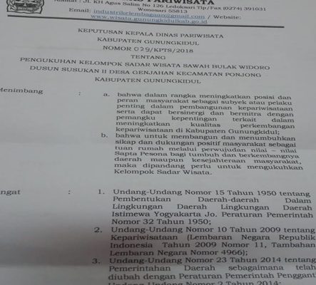 “Dengan terbitnya SK Dispar terkait Pokdarwis Bulak Widoro, akan menjadi pegangan kami dalam menjalankan dan memajukan sektor wisata di Genjahan Ponjong,” ungkap Widodo, (15/12).