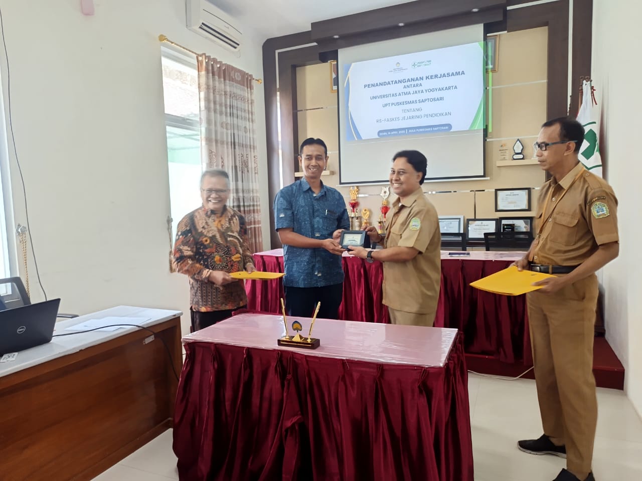 MOU kerjasama yang ditandatangani Wakil Rektor 3, Ir Yosef Daryanto ST. M.Eng, PHD dan Dekan Fakultas Kedokteran Universitas Atma Jaya, DR., dr., Fx. Wikan Indrarto Sp A, serta dr. Ari Hermawan, selaku Kepala Puskesmas Saptosari.