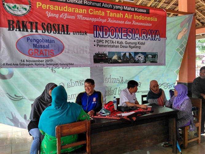 GEDANGSARI, Selasa Pon – Organisasi Persaudaraan Cinta Tanah Air (PCTA) Indonesia melaksanakan bakti sosial (baksos) di Wilayah Gunungkidul. Kali ini PCTA membuka pengobatan gratis di Rest Area Desa Ngalang, Kecamatan Gedangsari. Dalam sehari delapan ratus pasien tertangani.