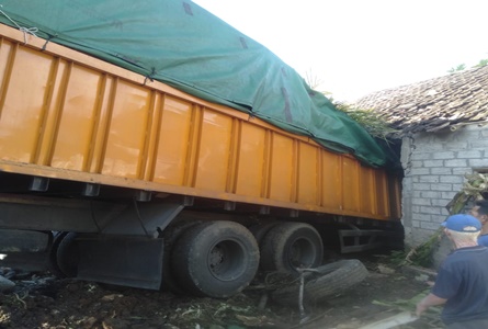 Sesampainya di jalan tikungan menurun, mendadak rem kendaraan tersebut blong sehingga pengemudi tidak bisa menguasai laju kendaraannya hingga menabrak rumah warga yang berada di sebelah kiri jalan.