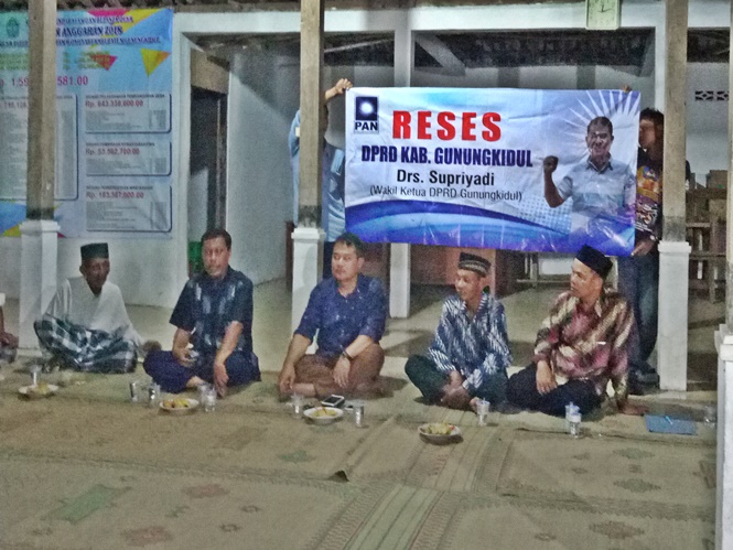 WONOSARI, JUMAT KLIWON-Dalam rangka menjaring aspirasi masyarakat secara berkala Wakil Ketua DPRD Kabupaten Gunungkidul Drs. H Supriyadi dari Partai Amanat Nasional (PAN) melaksanakan agenda reses bertemu langsung konstituen pada daerah pemilih (dapil) 1 di Padukuhan Walikan Desa Pulutan, (15/04).
