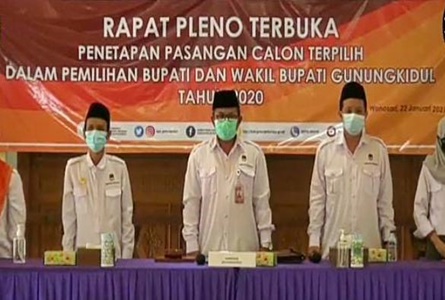 WONOSARI-JUMAT PON | Pasangan Sunaryanta-Heri Susanto resmi ditetapkan sebagai Calon Bupati dan Wakil Bupati Gunungkidul terpilih pada Jumat, (22/01/2021), oleh Komisi Pemilihan Umum (KPU) Gunungkidul. Bertempat di Bangsal Sewokoprojo, Wonosari, rapat pleno penetapan tersebut turut dihadiri Bupati Gunungkidul Badingah.