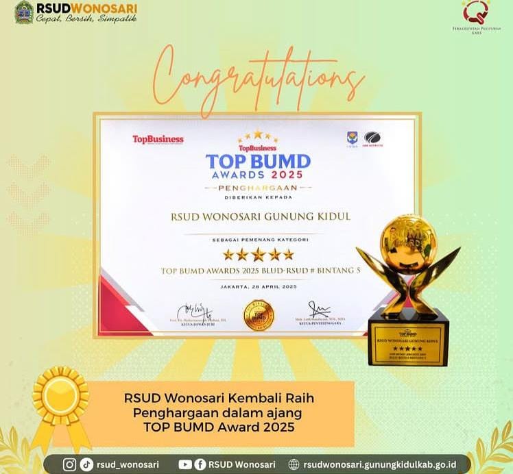 RSUD Wonosari kembali menorehkan prestasi membanggakan dengan meraih TOP BUMD Awards 2025 kategori BLUD-RSUD Bintang 5 ⭐⭐⭐⭐⭐ dari Top Business!,” demikian caption unggahan RSUD.