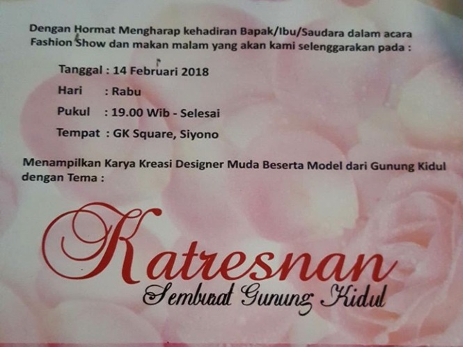 Acara dilaksanakan Rabu, (14/02) dimulai pukul 19.00 wib hingga selesai. Sejumlah pelajar putra putri dari Gunungkidul direncanakan turut meramaikan model fashion shoow.