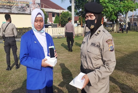 WONOSARI – JUMAT PAHING | Tri Novi Rahmadani remaja (16) menerima handphone dari Anggota Polisi Wanita (Polwan) Polres Gunungkidul. Remaja tersebut sebelumnya seolah kehilangan arah dan hampir putus asa untuk melanjutkan sekolah, sejak pemerintah menganjurkan belajar di rumah (BDR),