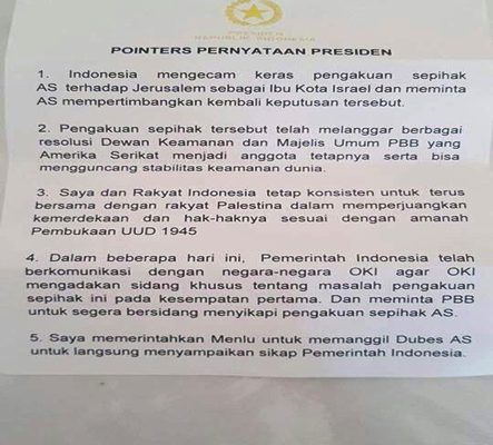 Kepada Mahmoud Abbas, Jokowi menyatakan ada lima pointers pernyataan sikap Indonesia merespons polemik terkait dengan Yerusalem itu. Pertama, Indonesia mengecam keras keputusan Amerika itu serta meminta Amerika Serikat mempertimbangkan kembali keputusan tersebut.