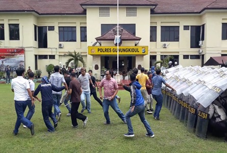 WONOSARI – Rabu Pon | Puluhan orang terlibat bentrok dengan aparat kepolisian di halaman Mapolres Gunungkidul, Rabu (12/02/2020) siang.