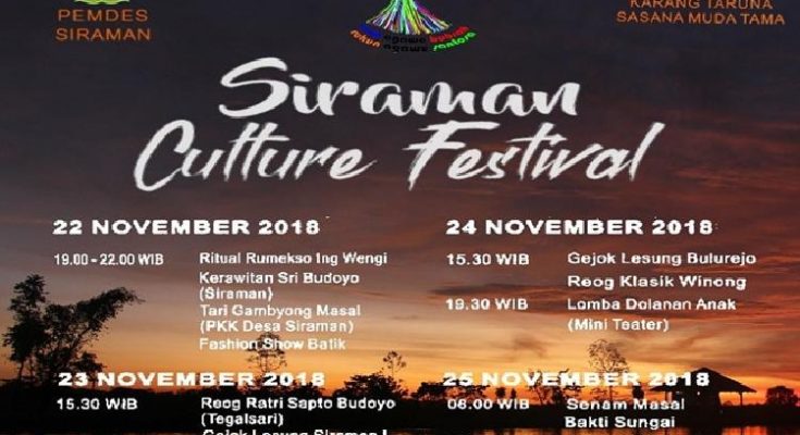 Heri Santosa Ketua Panitia menjelaskan, SCF 2018 akan menjadi kegiatan tahunan dengan konsep mewah dan megah. Semua unggulan potensi seni dan budaya asli Desa Siraman ditampilkan secara terjadwal baik yang berupa pertunjukan maupun perlombaan.
