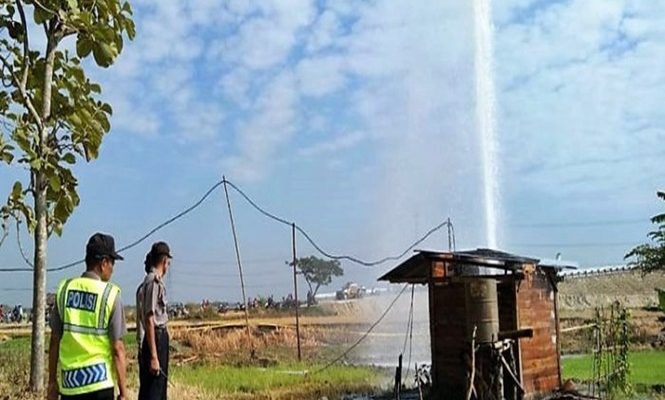 NGAWI, SELASA WAGE – Kekuatan semburan air bercampur lumpur di Ngawi begitu kuat. Tiga pipa besi berukuran tiga inchi yang tertanam di tanah sedalam 12 meter terbawa semburan air. Tinggi semburan pertama kali mencapai 150 meter.